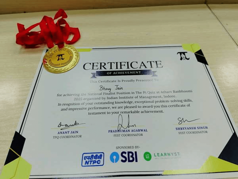 Bhavy Jain of Class XII F made the school proud with his brilliant performance in the prestigious PI Quiz Competition organized by IIM Indore. After qualifying among the top 40 finalists from schools across India, Bhavy impressed everyone with his sharp intellect and quick thinking in areas like Game Theory, Finance, and Management. Competing against some of the brightest young minds, he secured an outstanding All India Rank 21, showcasing his passion, perseverance, and remarkable academic excellence.