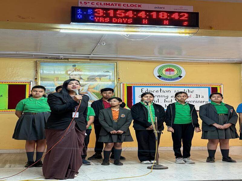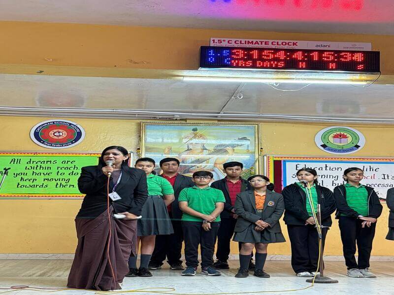 A Climate Clock Awareness Session was conducted during the morning assembly to emphasize the significance of the Climate Clock installed in the school assembly area. The session was led by the FEM Coordinator and speaker Mrs. Nidhi Jain who informed the students that the Earth is warming at an alarming rate and that the world is moving closer to the critical 1.5°C threshold making immediate climate action necessary. She explained that the Climate Clock serves as a constant visual reminder of our collective responsibility to protect the planet. Students were motivated to contribute through simple and effective actions such as saving electricity reducing waste avoiding plastic conserving water and adopting responsible consumption habits. The session reflected the school’s strong commitment to sustainability and encouraged students to become environmentally responsible citizens working towards a greener and safer future.