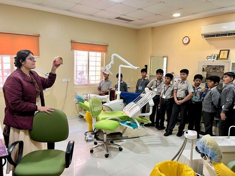 As part of a science activity, Class V students visited Choithram Hospital on November 10 & 11, 2025 to attend a Dental Health Awareness Talk conducted by Dr. Huma Qureshi. The session aimed at promoting good oral hygiene among young learners. Dr. Qureshi interacted warmly with the students and explained the importance of brushing twice a day, regular dental check-ups, and maintaining healthy eating habits. She cautioned against excessive consumption of sugar and junk food and highlighted the role of calcium-rich foods in strengthening teeth. Using models, she demonstrated how germs affect dental health. Students participated enthusiastically, making the visit an informative and motivating learning experience.